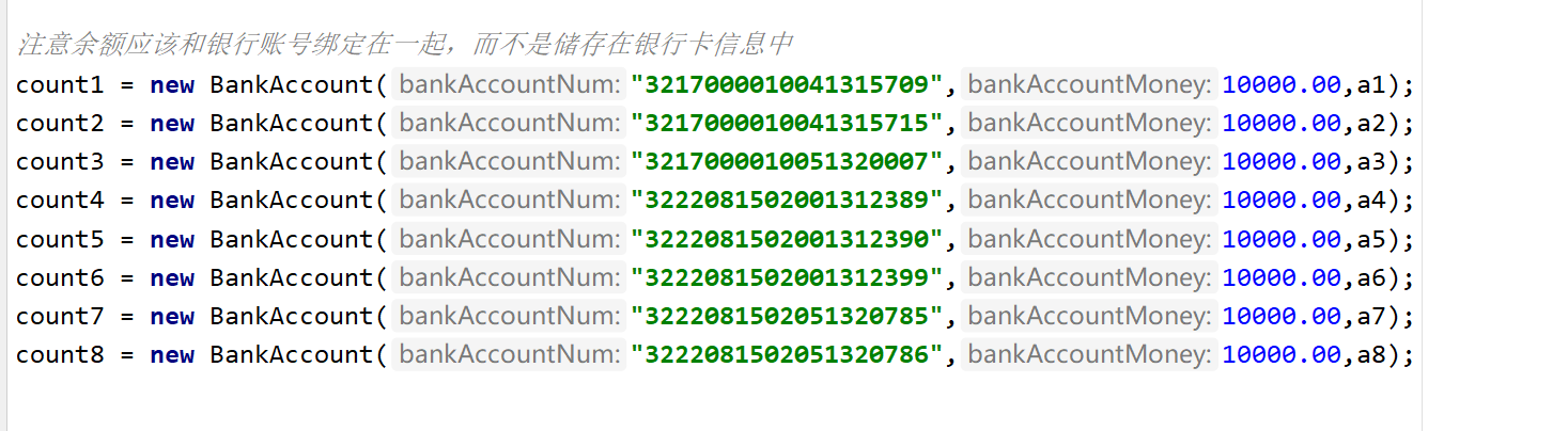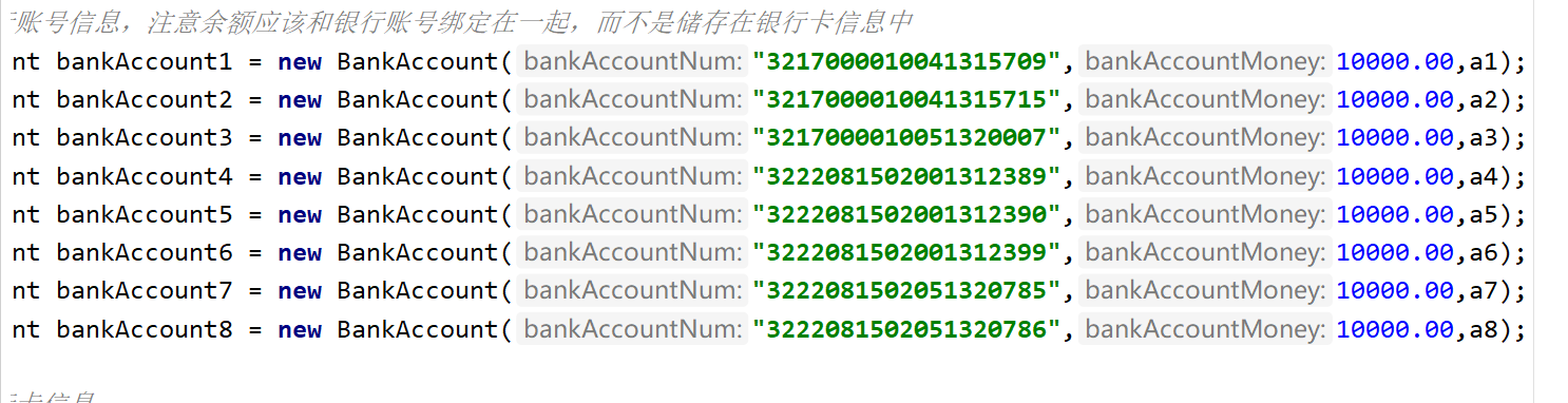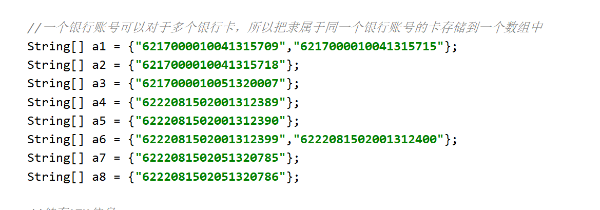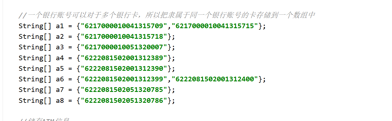 该题目的难点是理清实体类之间的关系,一个银行账户可以对应多张银行卡,所以不同的银行卡进行存取款操作时其实是对银行账户的余额信息进行操作。银行账户信息列表中应该存储银行卡号信息的数组,这样就能实现一个银行账户可以对应多张银行卡了。
