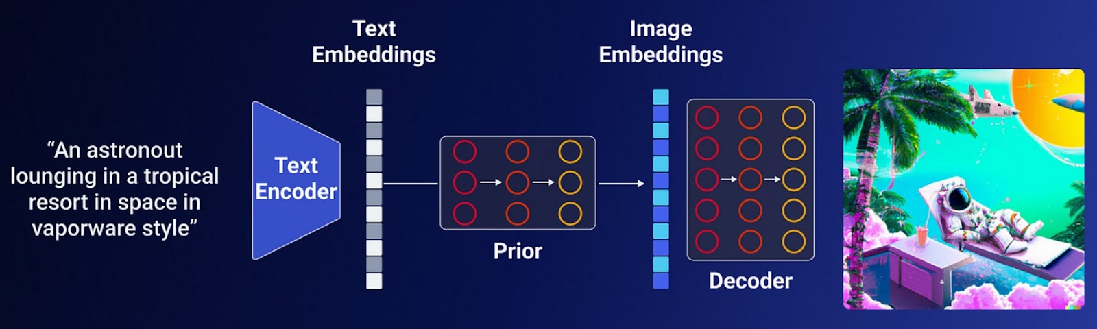 The embeddings come from CLIP (Contrastive Language-Image Pretraining). CLIP is trained on millions of images and their captions, to understand the relation between text and images. The model is designed to test how well a given caption matches an image, rather than predicting captions based on images. CLIP generates text and image encodings of each image-caption pair. It then calculates the cosine similarity of each of these embeddings. It minimizes the similarity between incorrect pairs and maximizes that of correct pairs. It then freezes and DALL-E 2 moves to the next task. CLIP guides the prior that takes text embeddings and turns them into image embeddings.