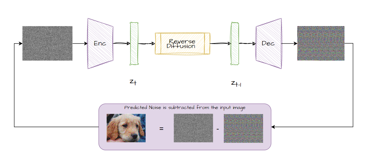 Once we have the training samples from the forward diffusion process. We can start training the generative model to generate images. The generative model generates images by removing noise from a completely noisy image. This happens in an iterative fashion. The generative model predicts the noise that has to be subtracted from the noisy image to get an actual image. Then a fraction of this noise is subtracted from the noisy image. The resultant image is then again fed to the network. This process is repeated for a set amount of steps.