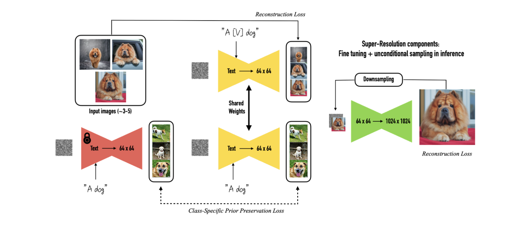 These two are the core of the finetuning with dreambooth. Once these are in place, one can finetune the smaller resolution model with class preservation loss and class noun prompting technique. And then finetune the larger model with the new images to ensure the fidelity of the generated images.