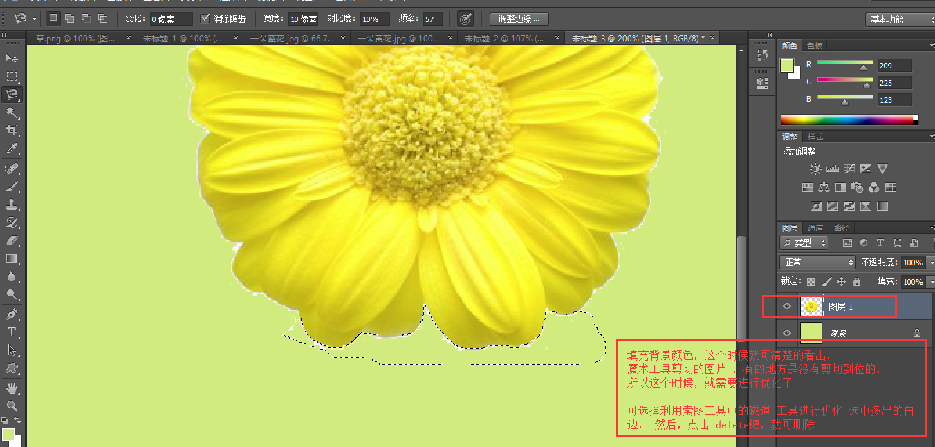 填充背景颜色,这个时候就可清楚的看出, 魔术工具剪切的图片 ,有的地方是没有剪切到位的,