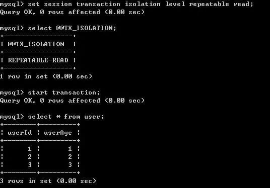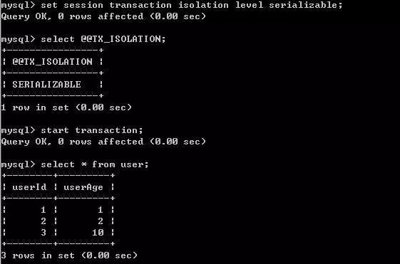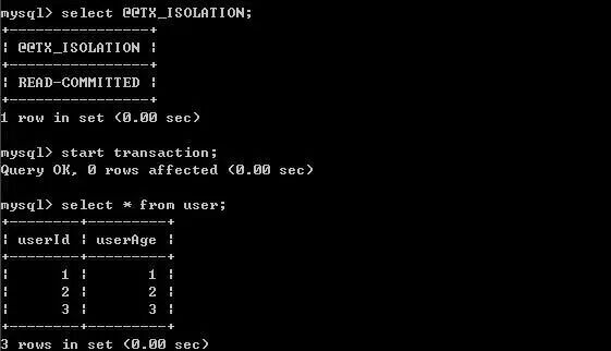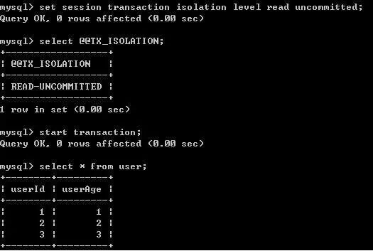 1)A 修改事务级别并开始事务,对 user 表做一次查询