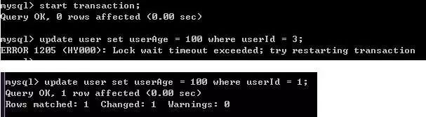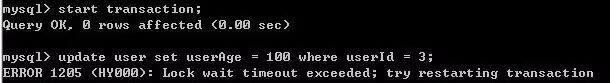 8)B 表重新开始事务,并对 user 表进行修改,修改被挂起,直到超时,对另一条记录修改却成功,说明 A 对表进行修改时加了行共享锁 (可以 select)