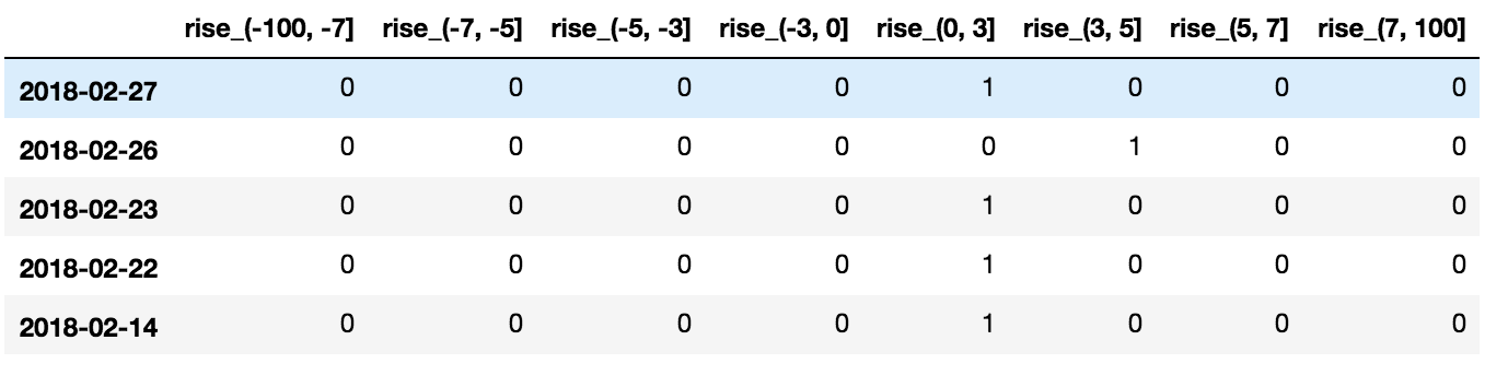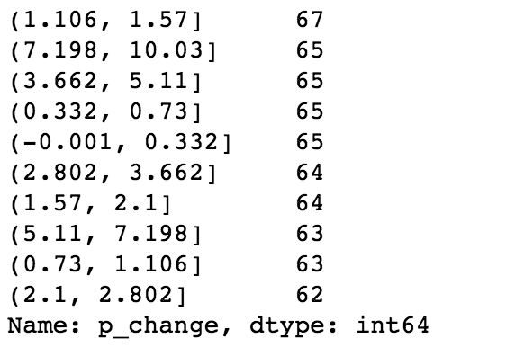 # 寻找星期几跟股票涨跌的关系 # 1、先根据对应的日期找到星期几 date = pd.to_datetime(data.index).weekday data['week'] = date # 2、把p_change按照大小分类,以0为界限 data['posi_neg'] = np.where(data['p_change'] > 0, 1, 0) # 通过交叉表找寻两列数据的关系 count = pd.crosstab(data['week'], data['posi_neg'])