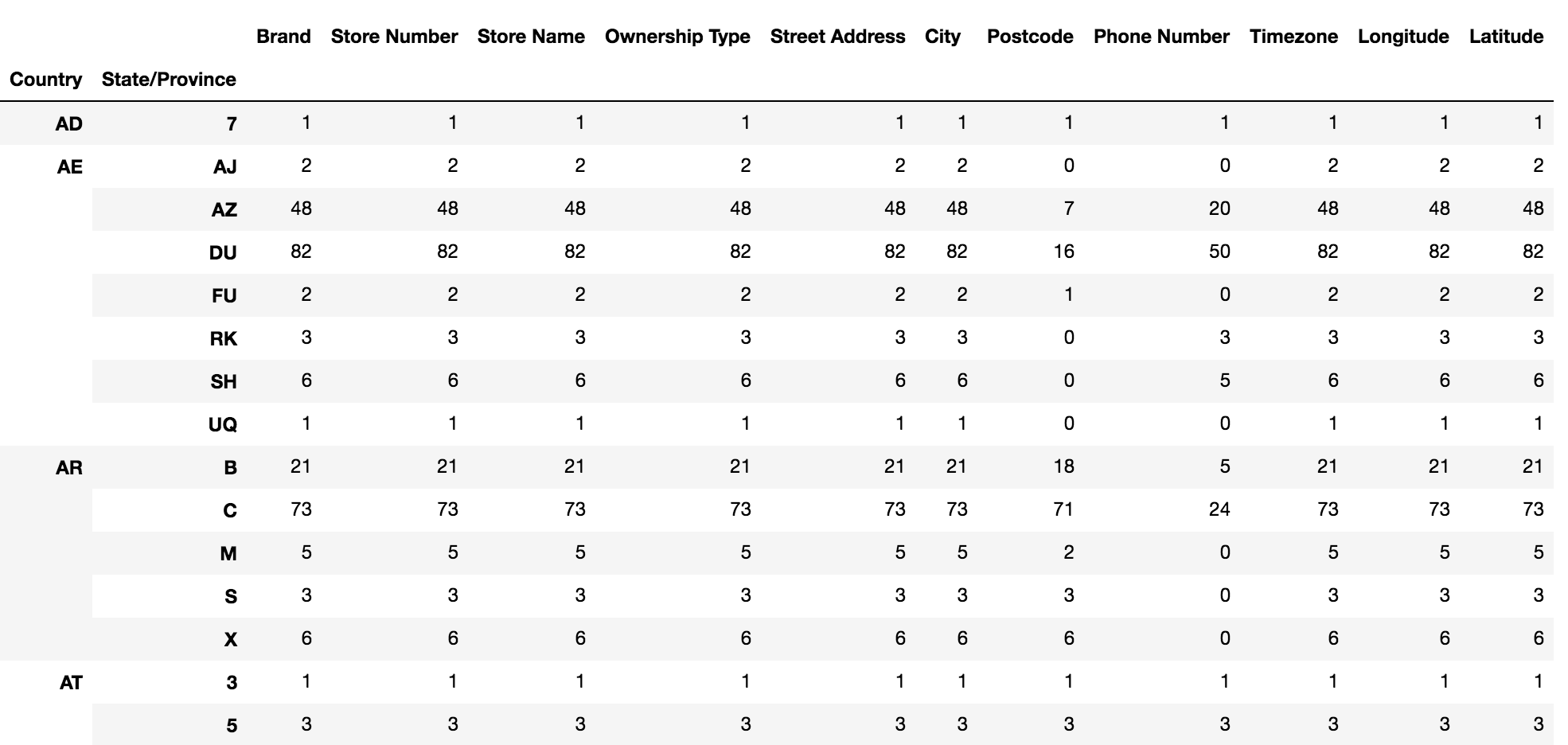 # 设置多个索引,set_index() starbucks.groupby(['Country', 'State/Province']).count()