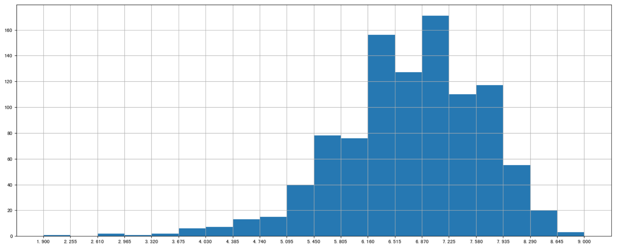 # 求出最大最小值 max_ = df["Rating"].max() min_ = df["Rating"].min() # 生成刻度列表 t1 = np.linspace(min_,max_,num=21) # [ 1.9 2.255 2.61 2.965 3.32 3.675 4.03 4.385 4.74 5.095 5.45 5.805 6.16 6.515 6.87 7.225 7.58 7.935 8.29 8.645 9. ] # 修改刻度 plt.xticks(np.linspace(min_,max_,num=21)) # 添加网格 plt.grid()