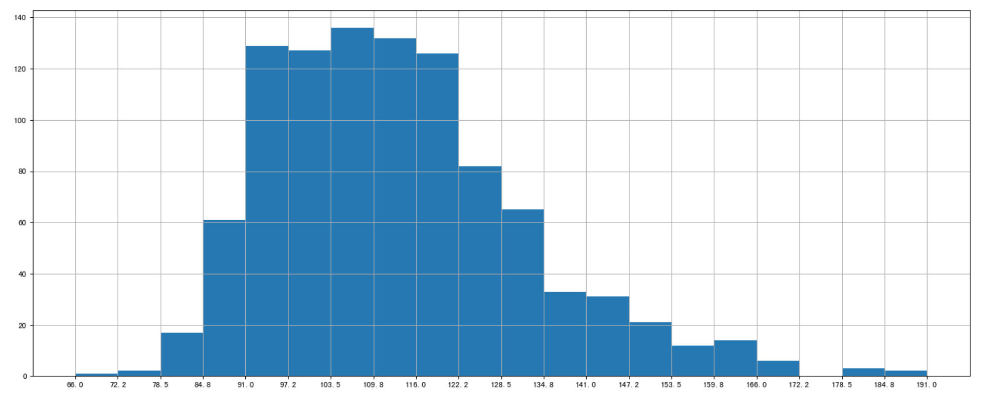 # 求出最大最小值 max_ = df["Runtime (Minutes)"].max() min_ = df["Runtime (Minutes)"].min() # # 生成刻度列表 t1 = np.linspace(min_,max_,num=21) # 修改刻度 plt.xticks(np.linspace(min_,max_,num=21)) # 添加网格 plt.grid()