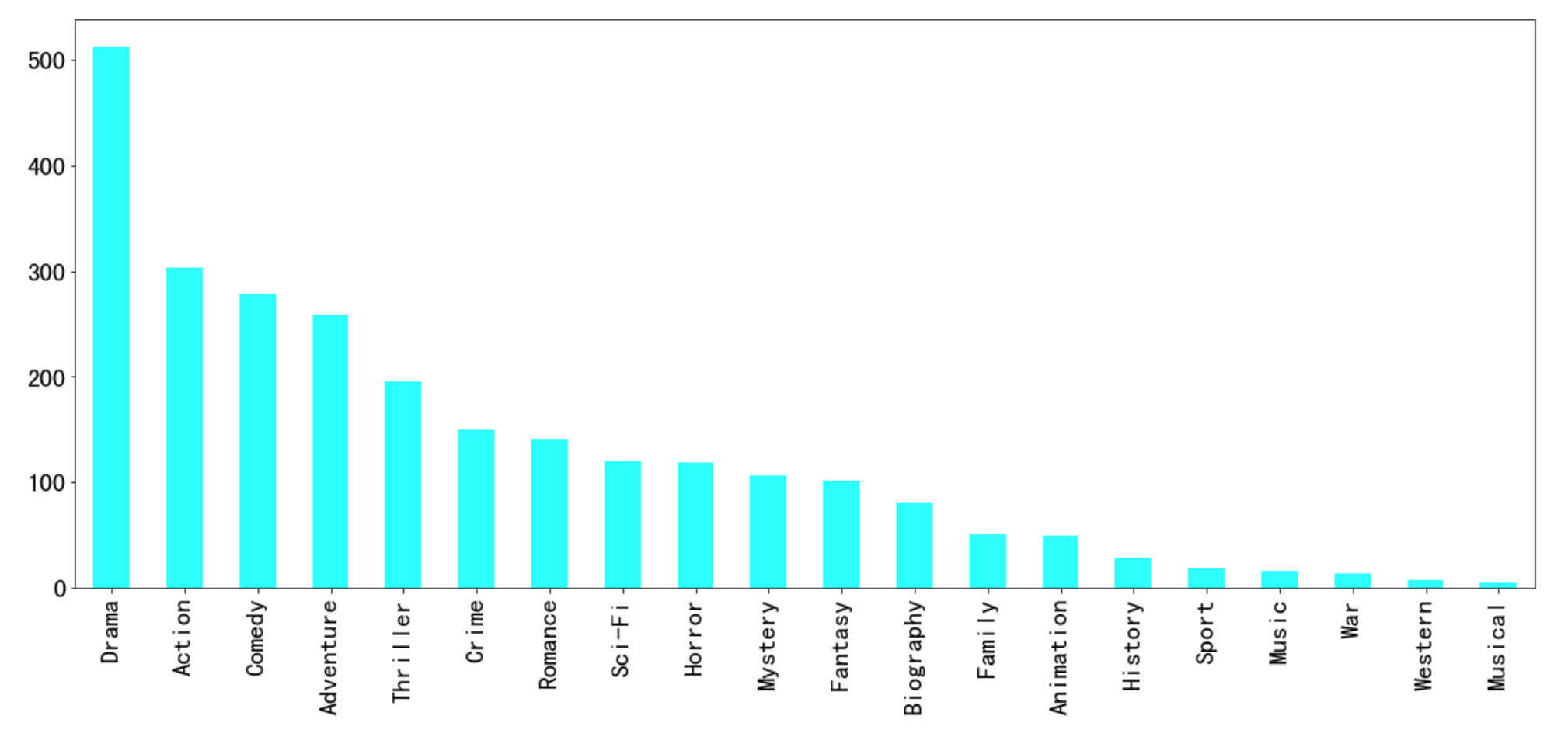 # 进行字符串分割 temp_list = [i.split(",") for i in df["Genre"]] # 获取电影的分类 genre_list = np.unique([i for j in temp_list for i in j]) # 增加新的列 temp_df = pd.DataFrame(np.zeros((df.shape[0],genre_list.shape[0])),columns=genre_list)
