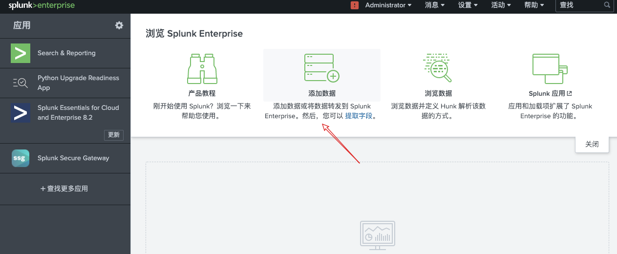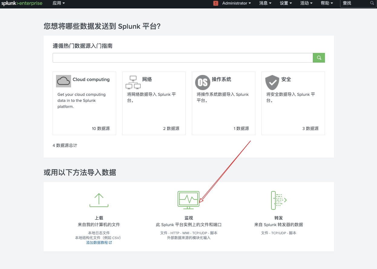 7.成功登录后,您将进入以下屏幕截图中显示的splunk管理控制台。 要监视日志文件,例如/var/log/secure ,请单击“ 添加数据” 。
