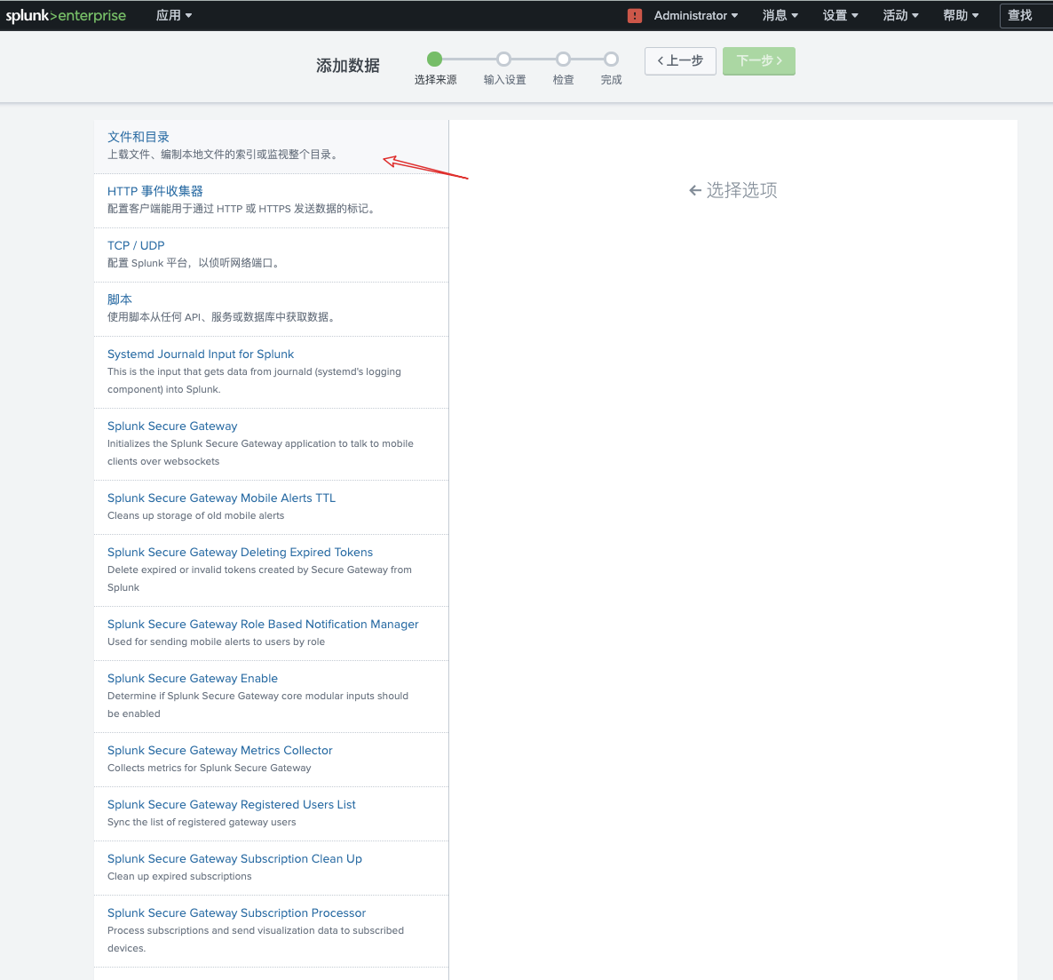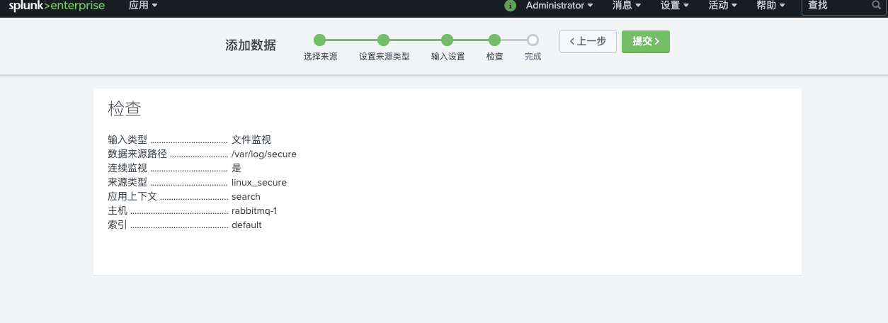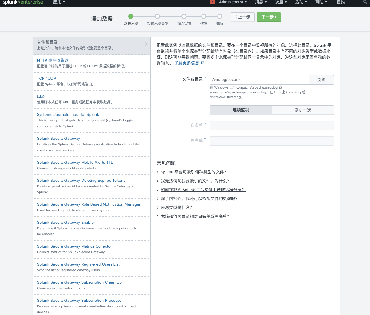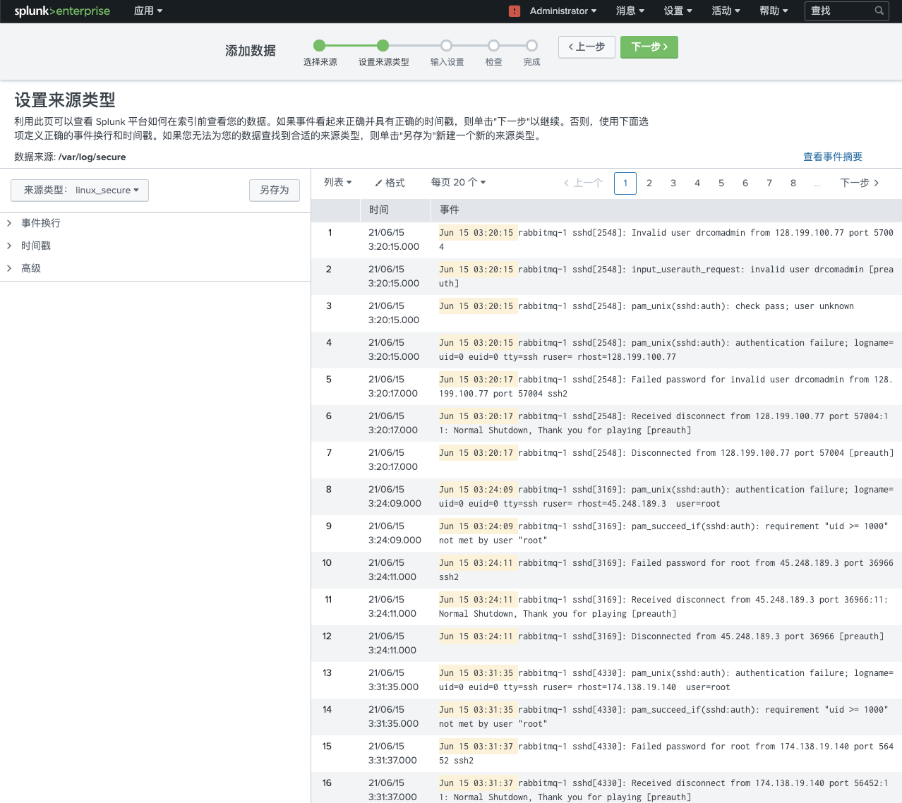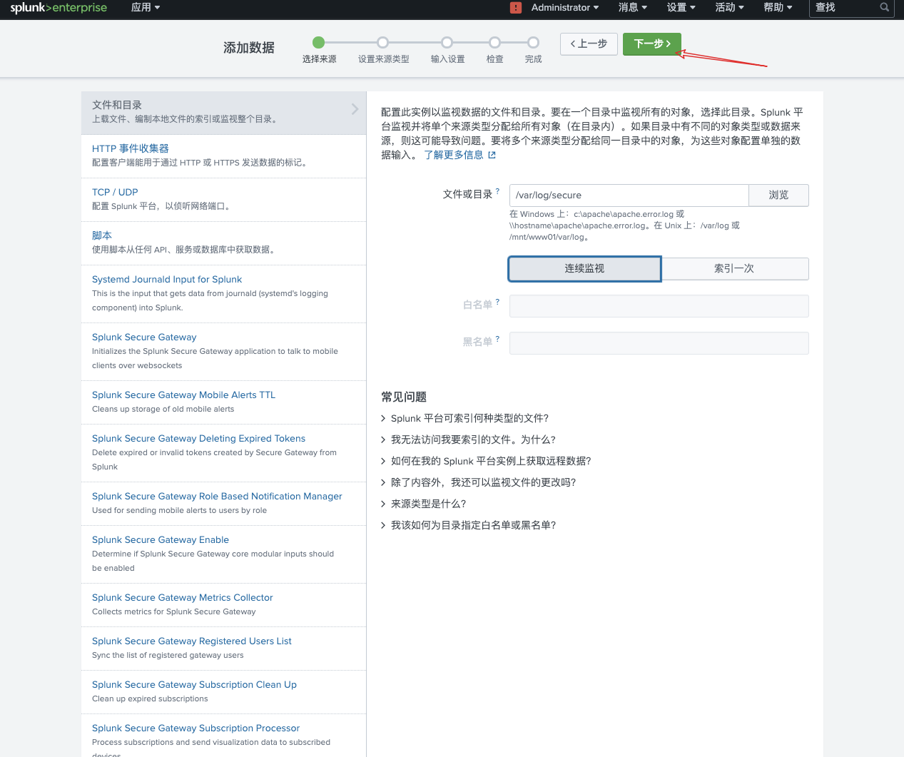 13.接下来,设置数据源的源类型。 对于我们的测试日志文件(/var/log/secure) ,我们需要选择Operating System→linux_secure ; 这让splunk知道该文件包含来自Linux系统的安全相关消息。 然后单击“ 下一步”继续
