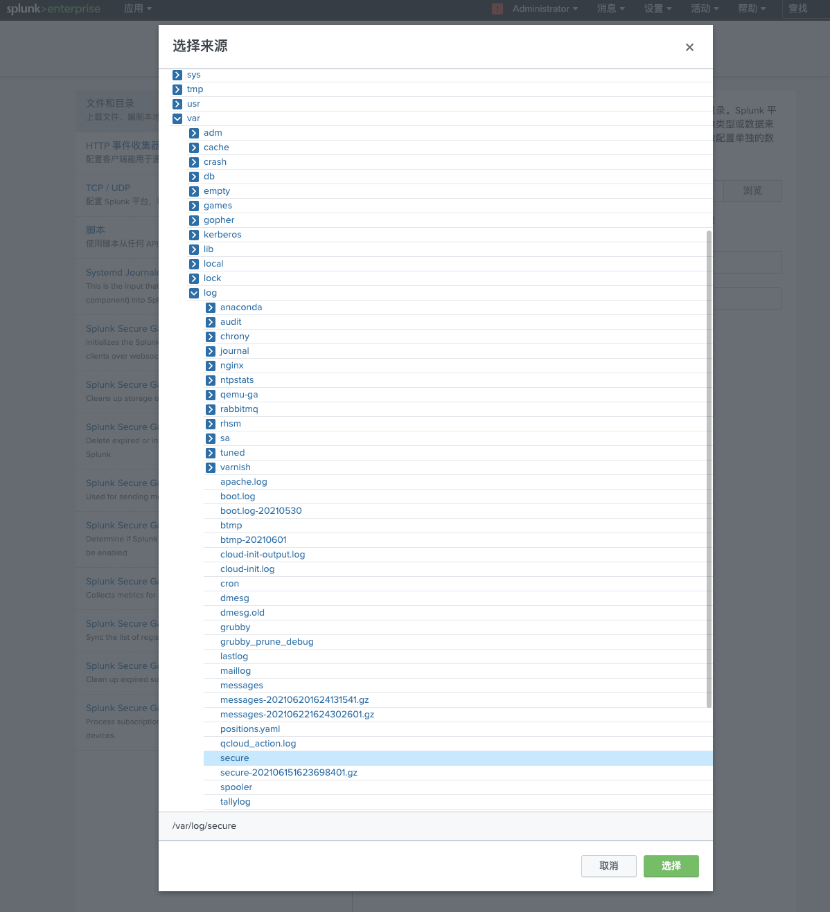 11.将显示root(/)目录中的目录列表,导航到要监视的日志文件( / var / log / secure ),然后单击“ 选择” 。