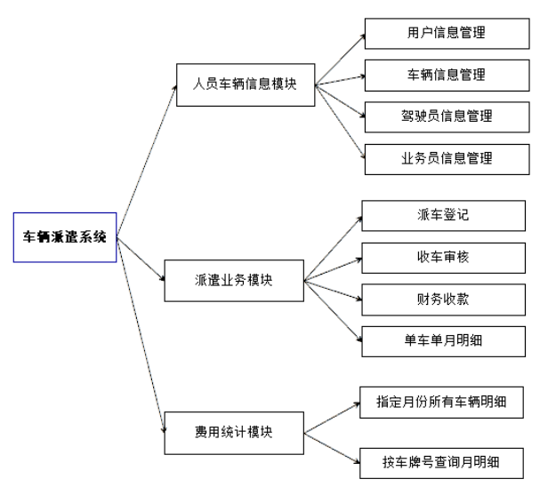 a) 概述:车辆派遣系统主要用于整合汽车租赁公司在产生业务时,各项信息的收集和统计。该系统主要分为三个部分:1、人员车辆信息模块(档案管理)。2、派遣业务模块(业务管理模块)。3、费用统计模块(查询统计)