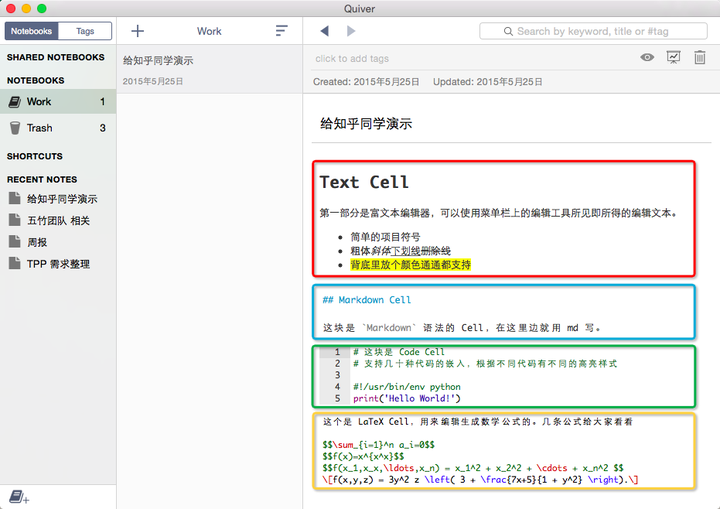 编辑区中4个框分别是4种编辑类型,它支持 Markdown 与富文本、代码、公式混排。