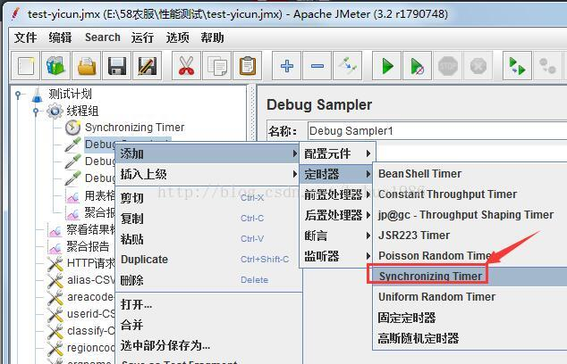 将测试元件Synchronizing Timer添加到请求之前或某个Sampler的子节点,右键菜单依次选择“添加–>定时器/Timer–>Synchronizing Timer”