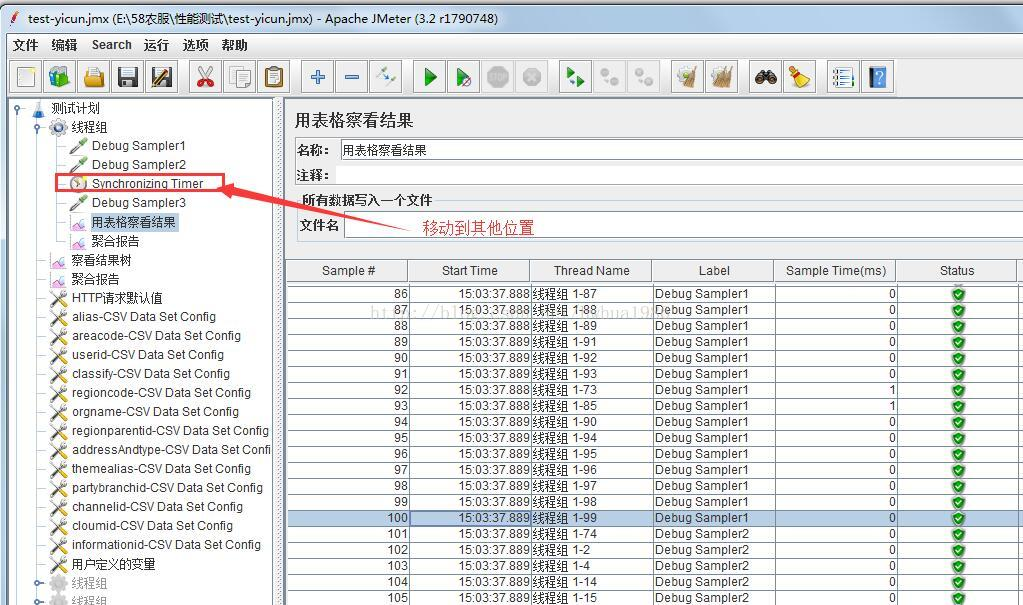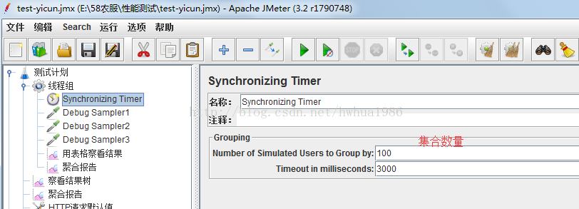Synchronizing timer 仅作用于同一个JVM中的线程,所以,如果使用并发测试,确保"Number of Simultaneous Users toGroup by"中设置的值不大于它所在线程组包含的用户数。