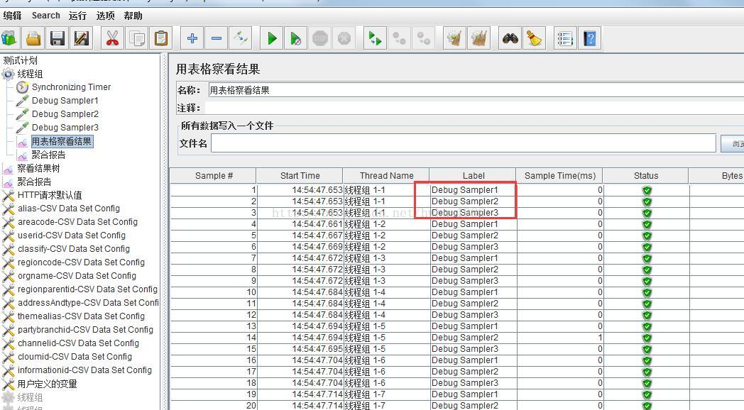 2、如上,添加相关请求,结果树等,进行必要设置后,运行查看效果