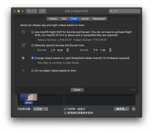 从 Apple TV 脱胎而来的 Aerial 屏保,也适配了深色模式,它会在日落后播放夜间屏保,在日出后播放白天的屏保。