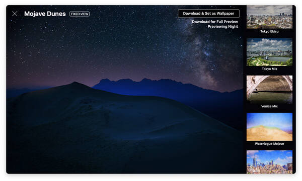 24 Hour Wallpaper 是基于 Hal Bergman 和 Josh Michaels 两位摄影师的摄影作品开发的壁纸软件。从 2011 年起,他们就花了大量时间进行 24 小时不间断摄影,并制作成了 macOS Mojave 动态壁纸。共计 58 款包括自然风光、城市摄影在内的动态壁纸,其中蓝天白云和繁星点点都会随着日出日落变化,美妙至极。