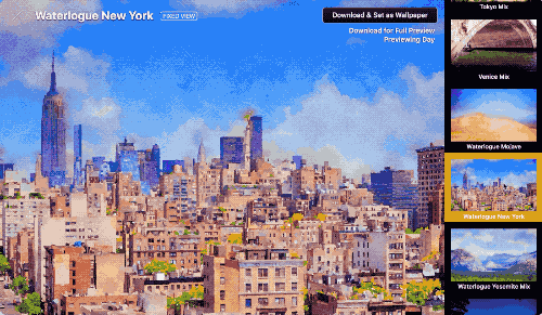 其中我最喜欢的水彩系列动态桌面壁纸,由摄影作品通过图像处理变成水彩画而来。这一系列的动态壁纸随时间变化既带有科技感,水彩风格又让壁纸带上艺术气息,把它们设为 macOS Mojave 桌面壁纸非常新颖别致。
