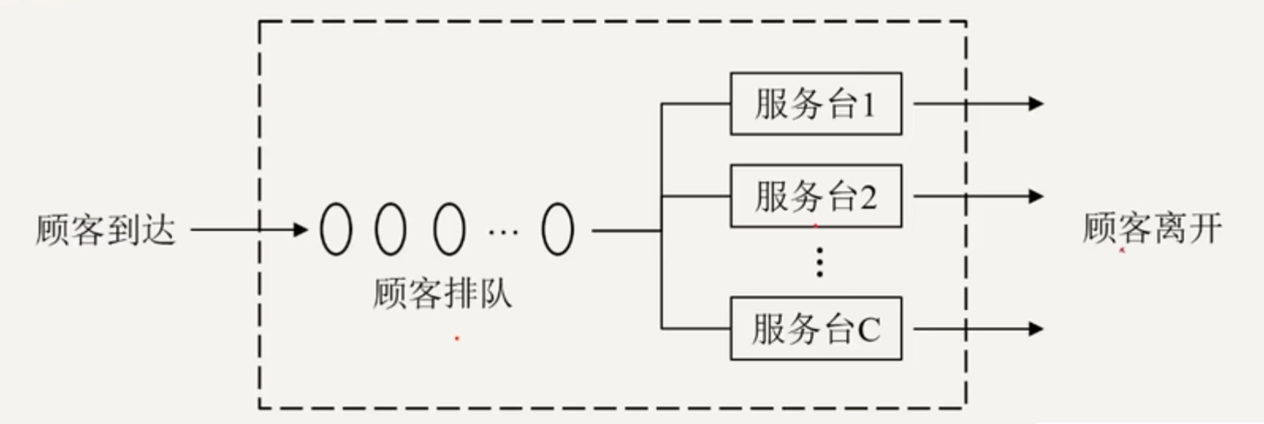- c 个服务器(c Servers): 系统包含 c 个并行工作的服务器,可同时为多个顾客提供服务;