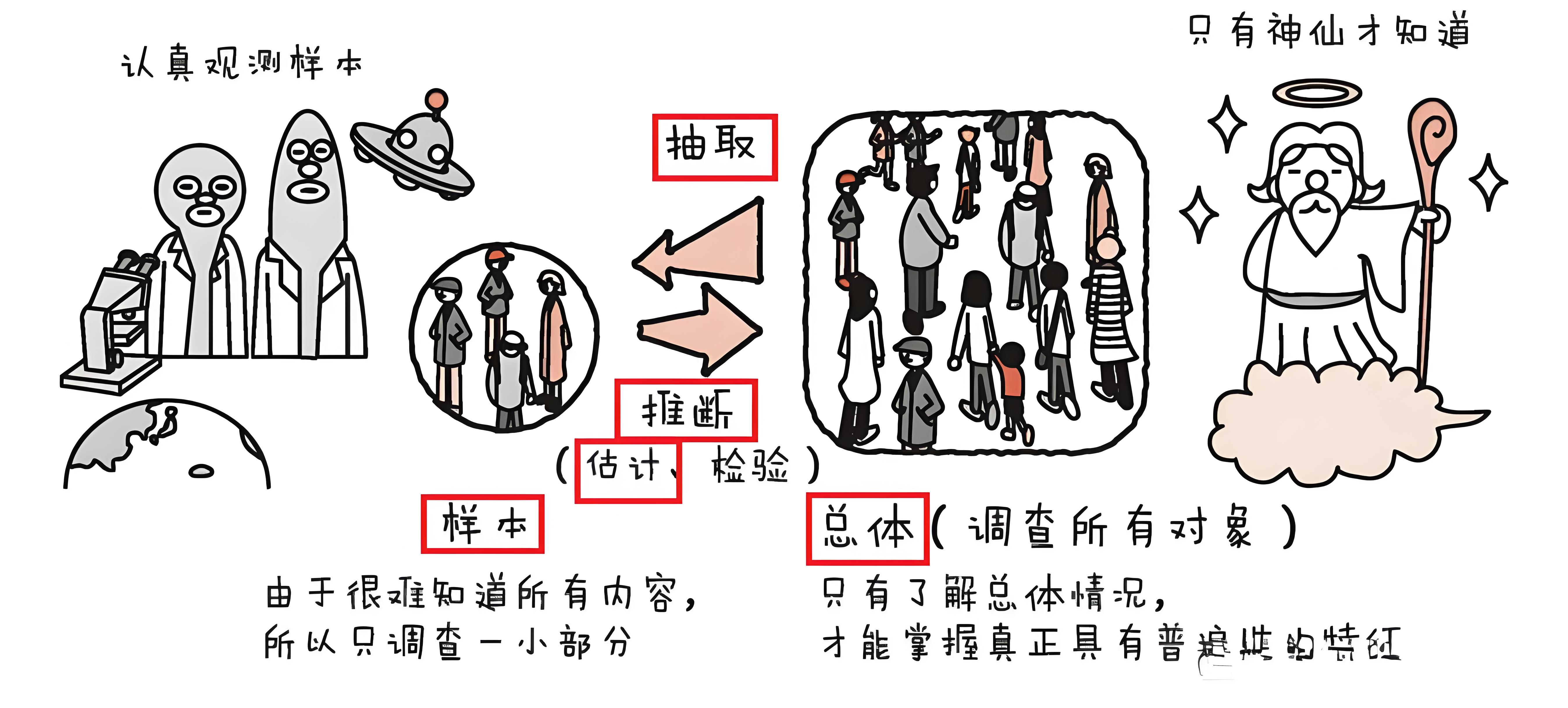 在统计学中,“样本”是从总体中随机抽取的一组观测值,记作 \(X_1, X_2, \ldots, X_n\),是总体的子集,具有独立同分布(i.i.d.)的假设前提。样本是我们进行推断的唯一数据来源。