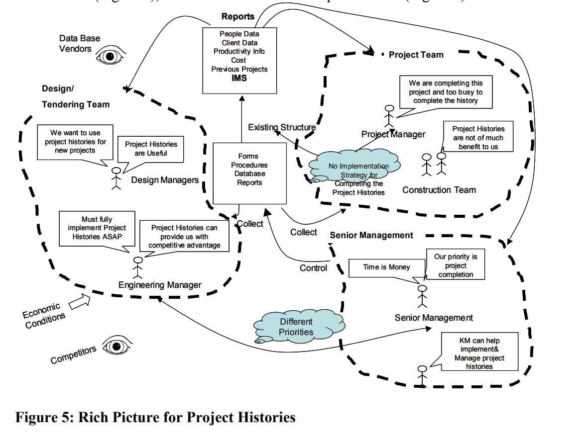 该阶段的关键工具是丰富图(Rich Picture)。这是一种图文结合的表达方式,用来展现情境中的: