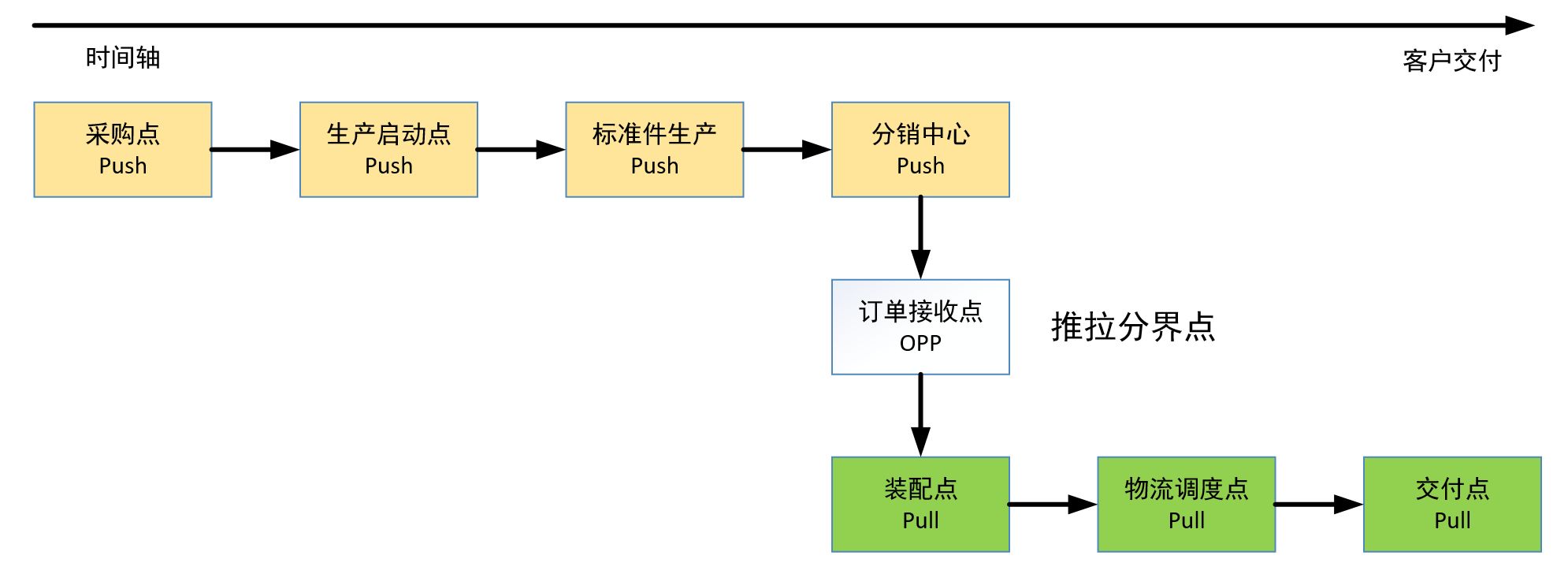 - 中间“订单接收点”是典型的推拉分界点,客户订单进入,供应链由推转拉。