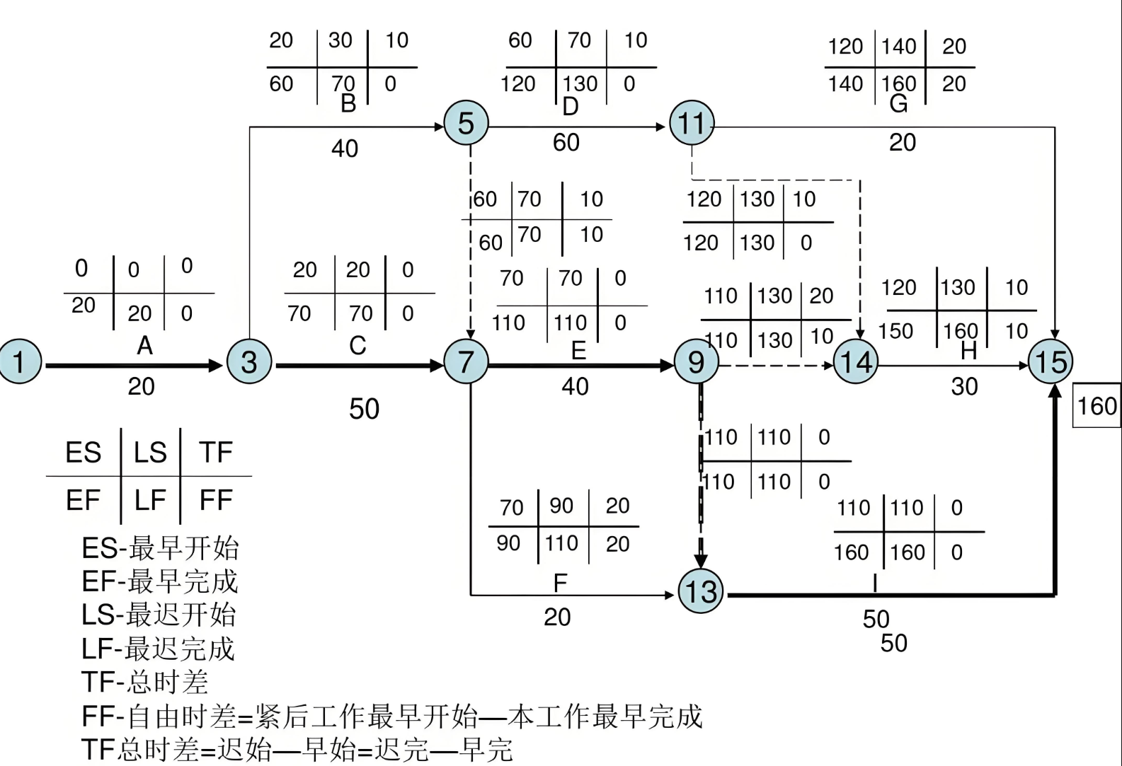 - 最早开始时间(ES) 和 最早完成时间(EF) 通过正向推导获得;