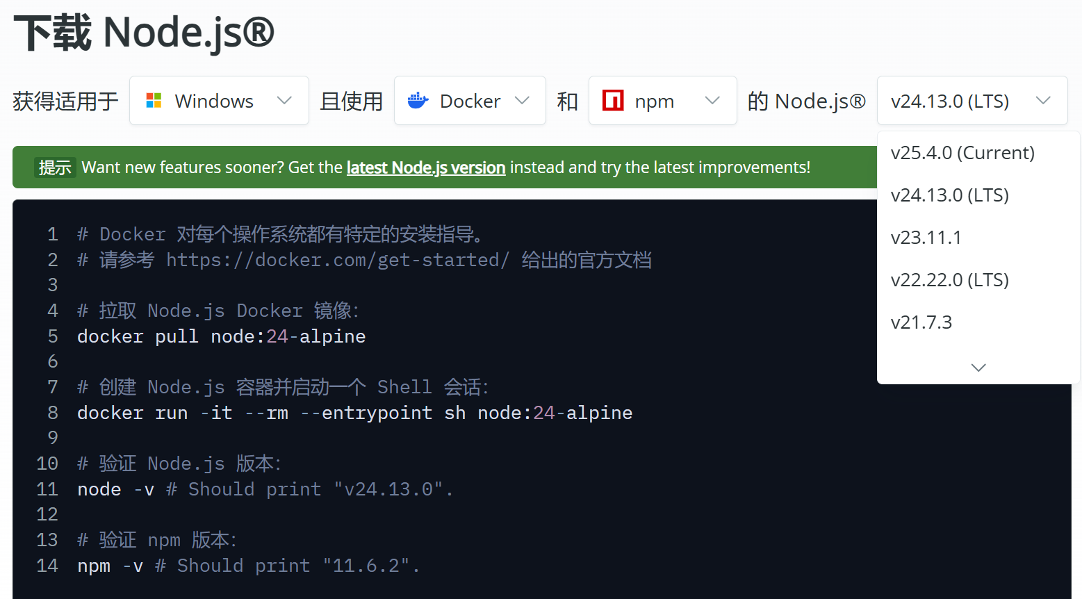 - 访问 Node.js 官网,选择 LTS(长期支持版)下载适合你操作系统的安装包。