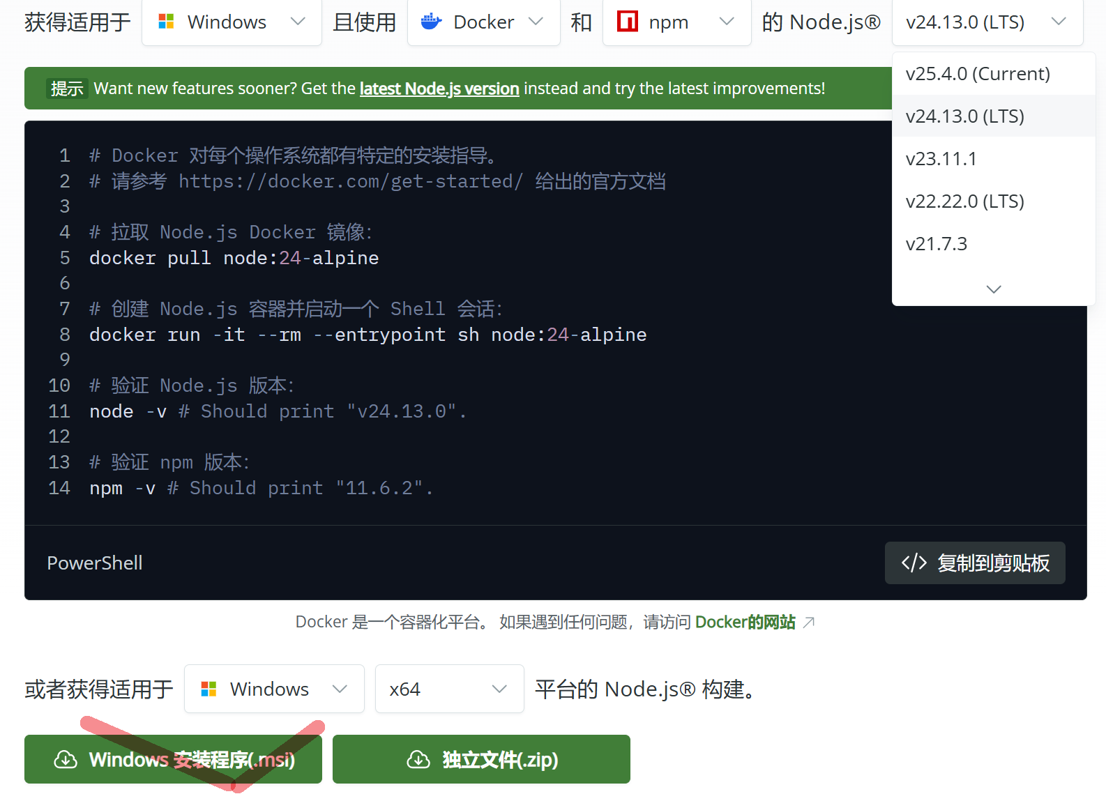 在 Node.js 官网下载页面中,选择适用于 Windows 系统的安装方式: