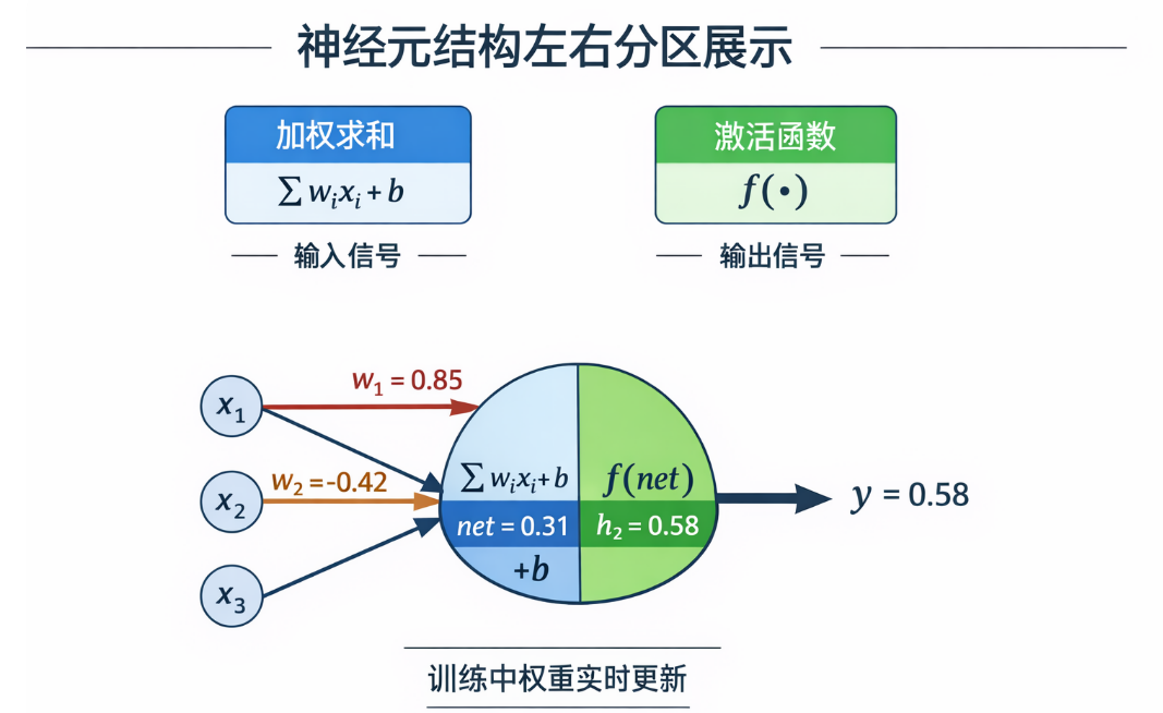 - 右侧:非线性映射区(Activation Area) 该区域负责执行激活函数运算 \(a=\sigma(z)\)。内部嵌入激活函数(如 Sigmoid 或 ReLU)的微型缩略图。它象征着信号从线性到非线性的跨越,其颜色深浅直接代表了该神经元最终向下一层传递的“激活强度”。