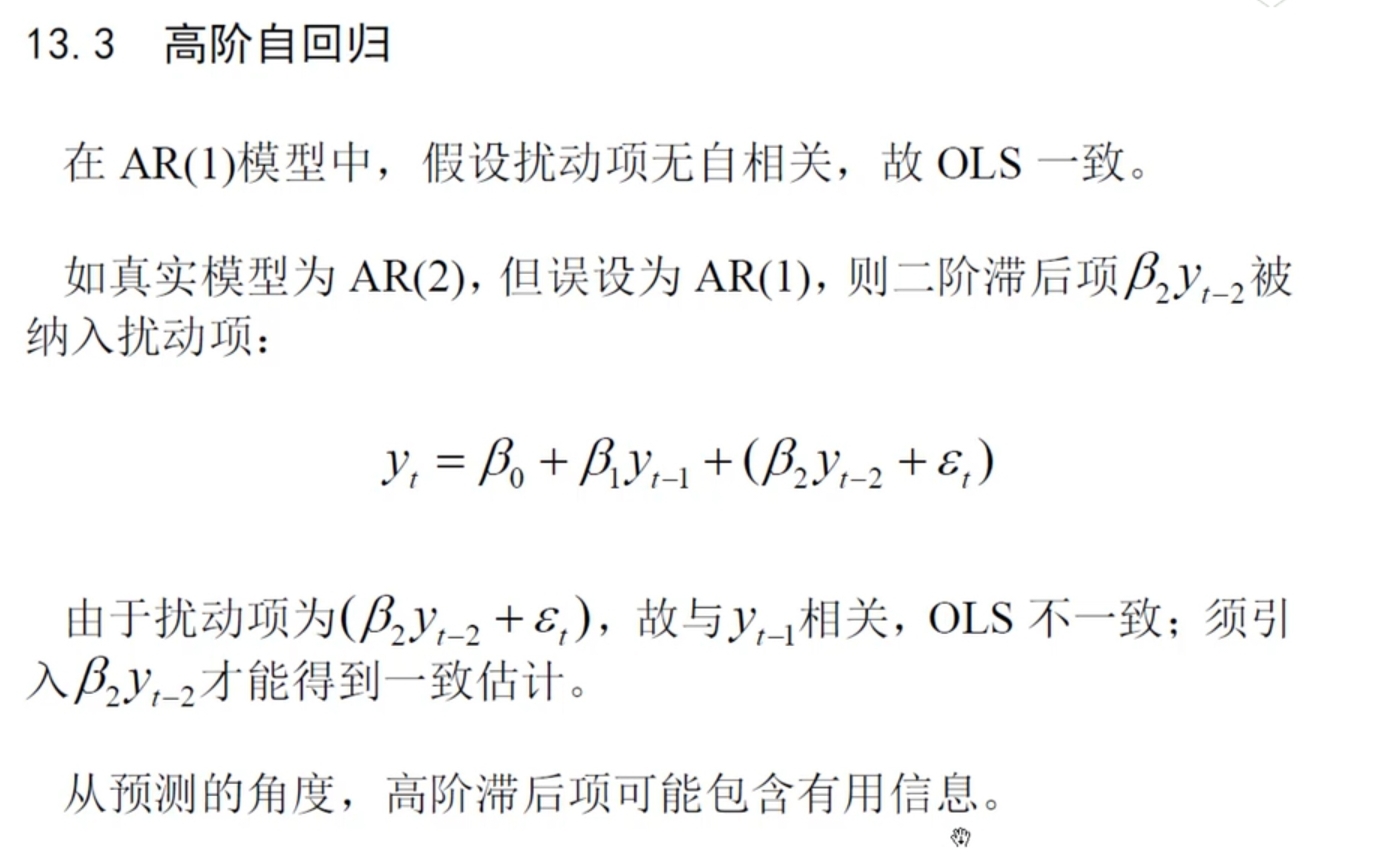 如果方程中含有二阶滞后项,但却采用一阶自回归方程,则会导致OLS不一致,出现同方差: