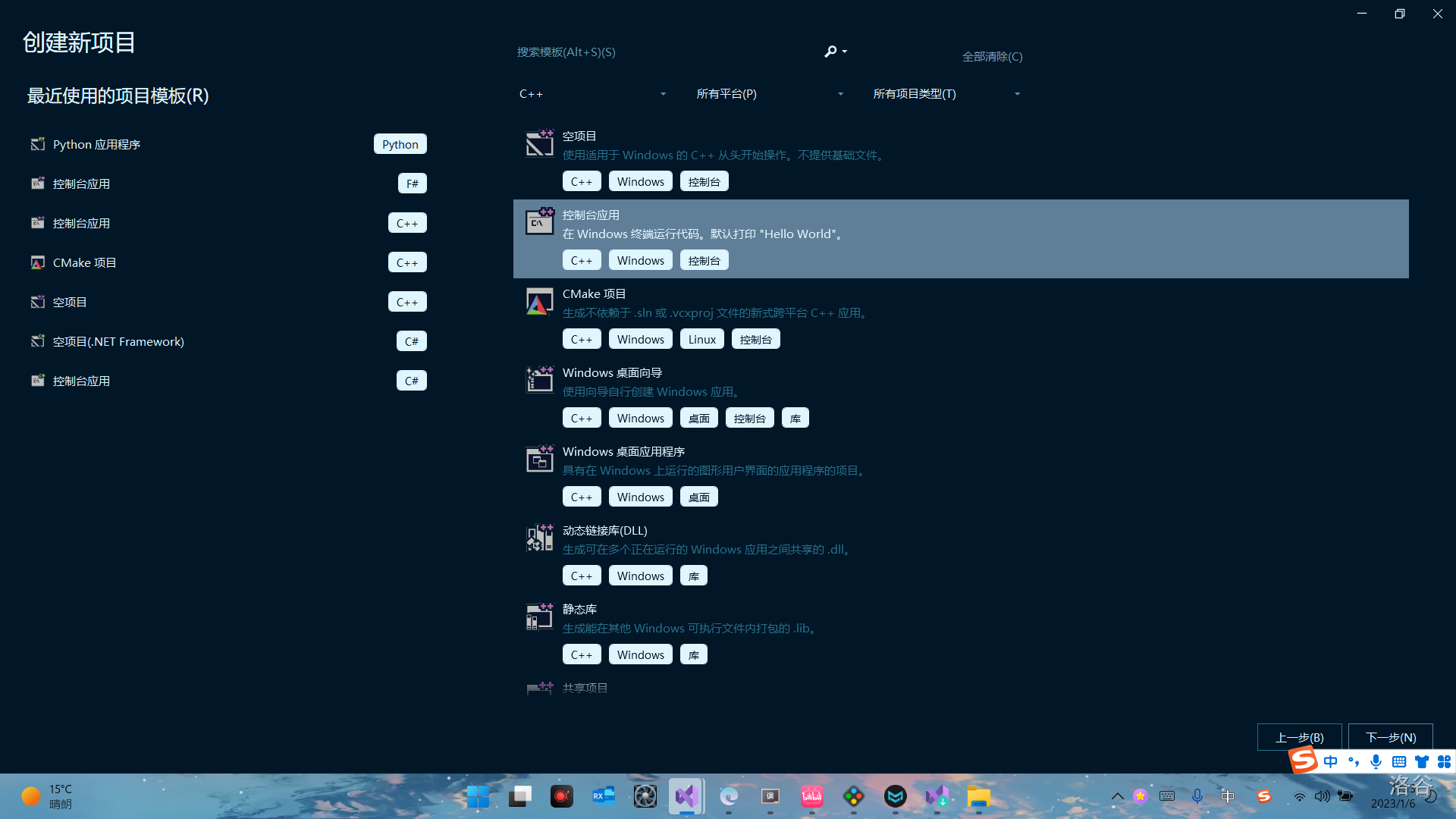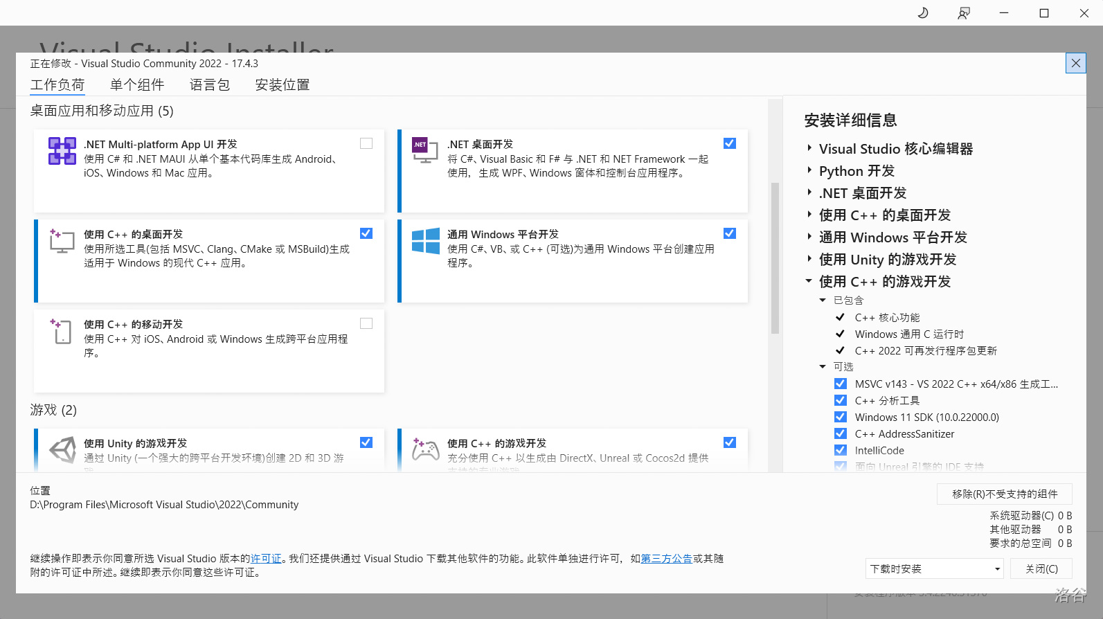 下载之后打开它,就会弹出安装界面。有各种各样的工作负载可以选,但 c++ 开发一般只用 使用c++的桌面开发 和 通用Windows平台开发 ,其他的酌情选择。勾选上,再改一改安装路径,尽量别安装在 C 盘上,避免卡得要死。