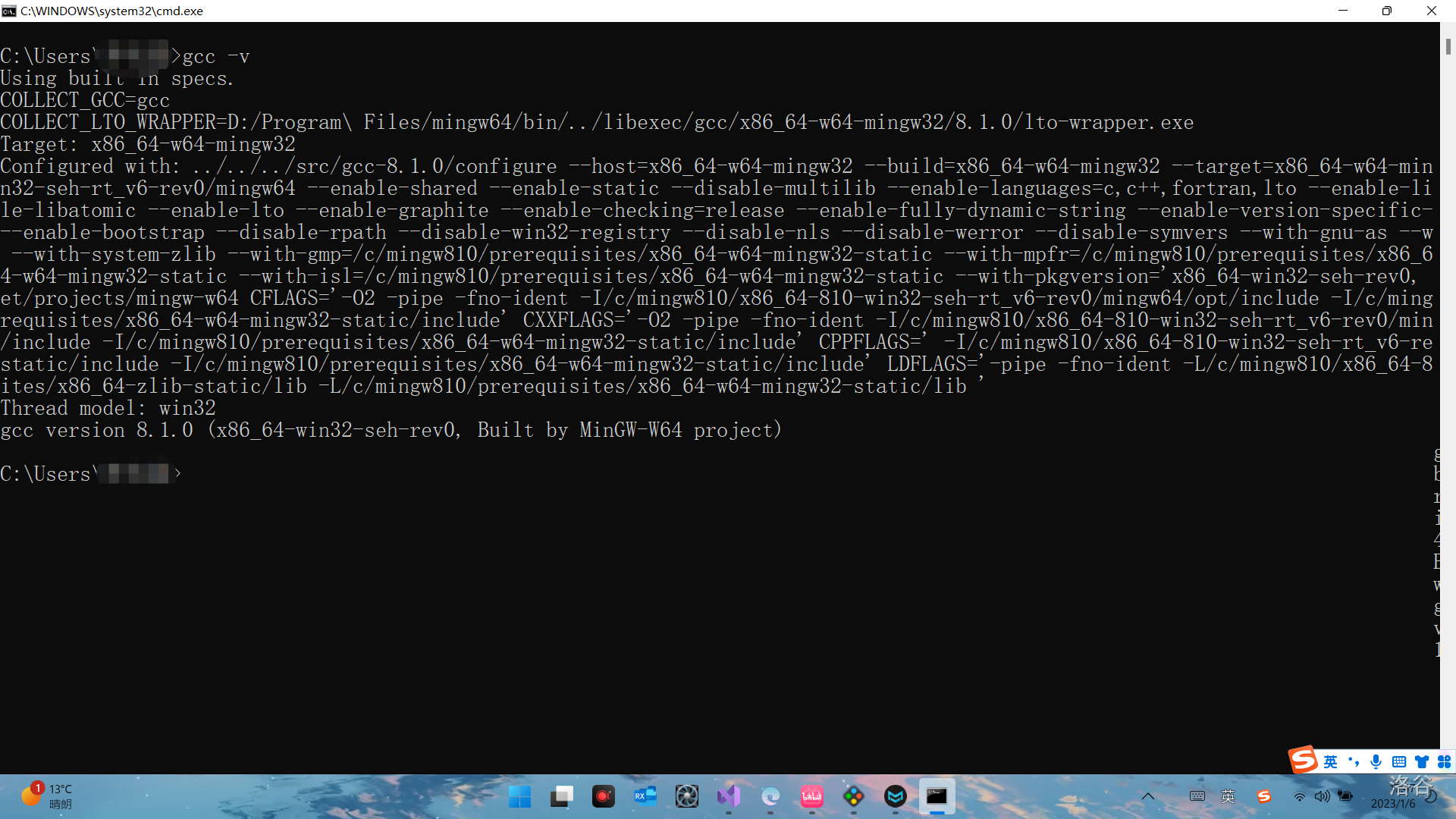 然后我们测试一下是否安装正确。按 Win + R 键打开运行,输入 cmd 回车,就来到了命令行。输入 gcc -v 或者 g++ -v ,如果没有报错则说明安装完毕 。