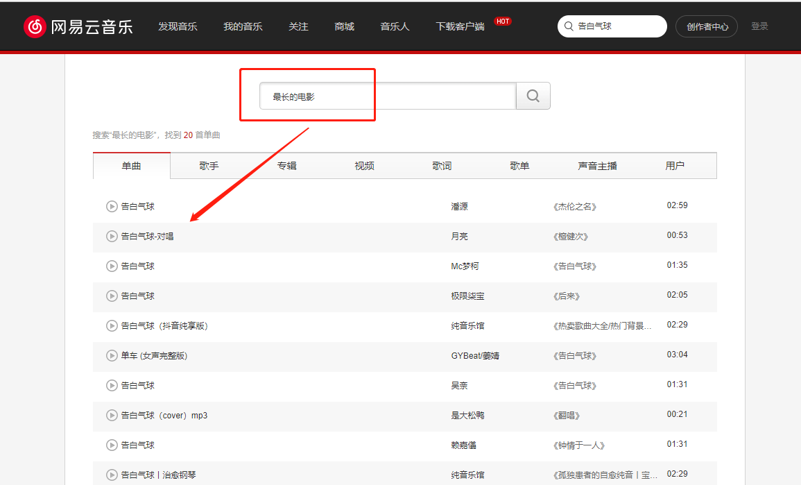 步骤4:返回网易云音乐,搜索 最长的电影 ,结果如下: