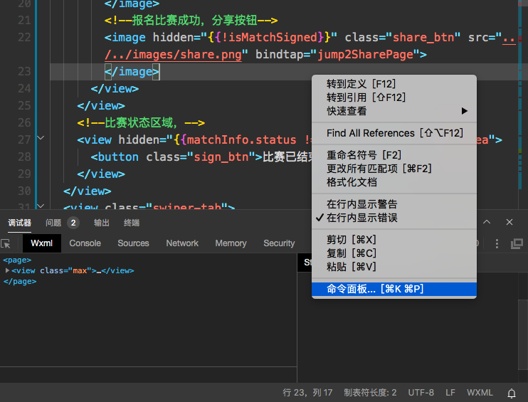 在微信开发者工具中,打开要改格式的代码,在代码区域点击右键,点击命令面板