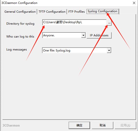 选择Syslog Configuration,然后指定syslog文件目录位置;我这里的路径是放在桌面的ftp文件夹中;其他的默认即可