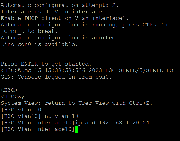 进入交换机之后,ctrl+d 或者atrl+c;然后创建vlan 10,进入vlan 10 添加和我的无线网卡同网段的地址