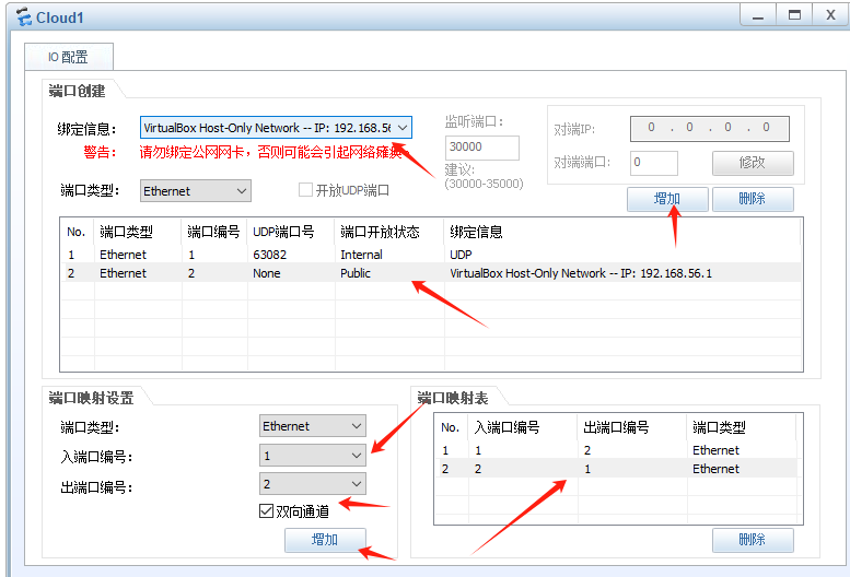 设置云:1、添加UDP端口;2、添加虚拟网接口 192.168.56.1;3、设置出入端口编号;3、勾选双向通道 4、增加
