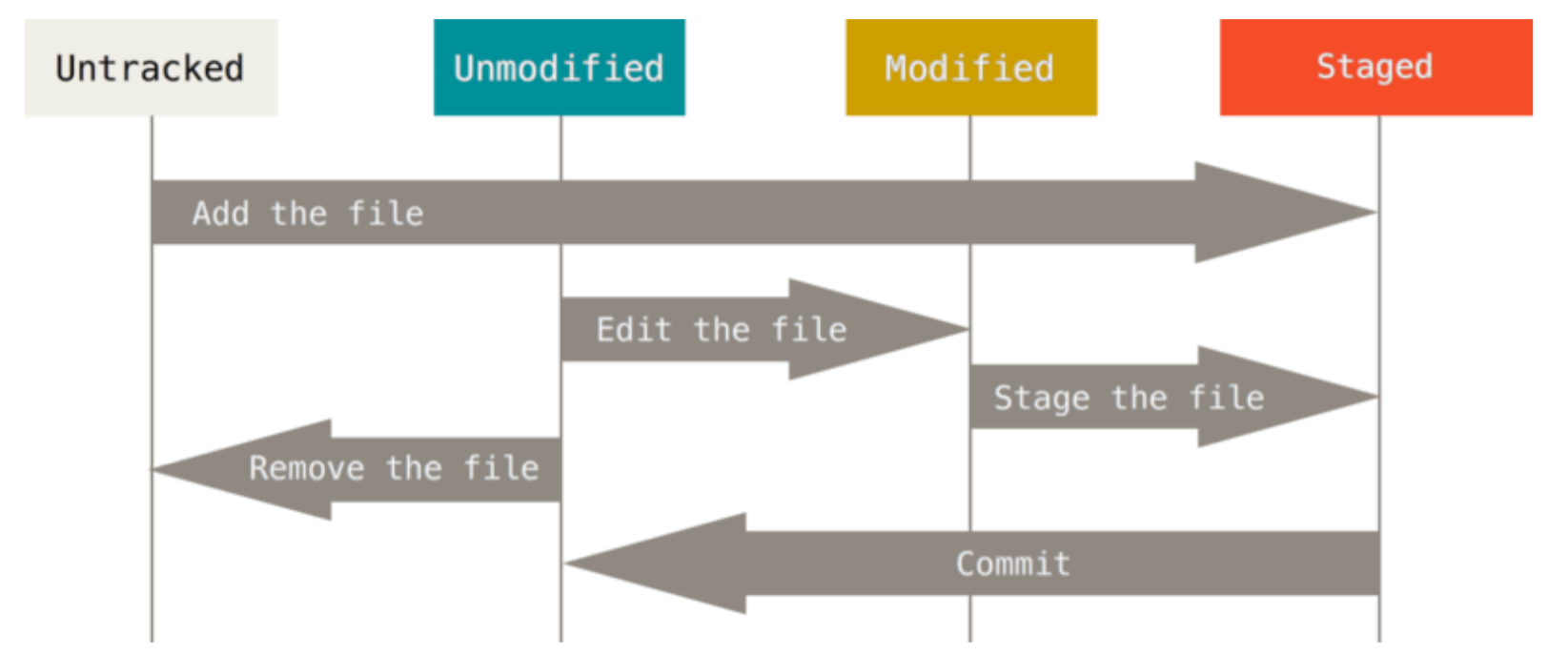 其中没有被git跟踪的文件处于Untracked的状态,一般处于Untracked的状态的文件是新添加到当前文件夹下的文件,如果文件被跟踪之后便进入暂存区,文件变成Staged状态,如果暂存区的文件被提交了(commit)之后文件便进入仓库区,处于Unmodified的状态,如果文件再一次被修改之后便处于modified的状态,这时需要将该文件放入暂存区(git add),然后再一次提交到仓库(git commit)注:处于Unmodified状态一定是被跟踪的文件