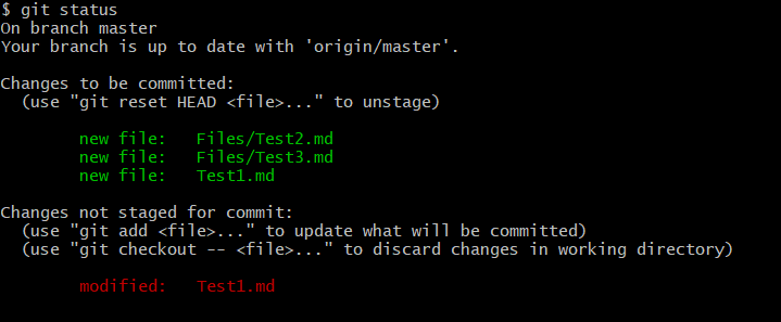 可以看到Test1.md同时处于Staged和modified状态,这里要说明的是,staged状态的Test1.md是未添加内容之前的Test1.md,而处于modified状态的是添加内容之后的Test1.md,如果想要暂存修改之后的Test1.md则使用git add Test1.md命令,现在的状态是: