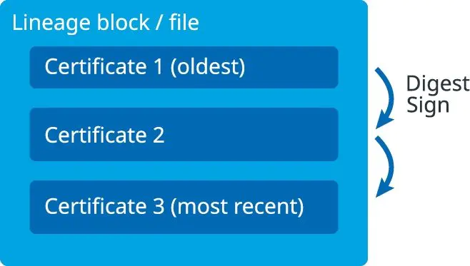 其中每个节点都包含用于为之前版本的应用签名的签名证书,最旧的签名证书对应根节点,系统会让每个节点中的证书为列表中下一个证书签名,从而为每个新密钥提供证据来证明它应该像旧密钥一样可信。