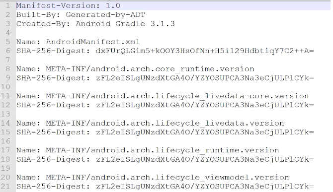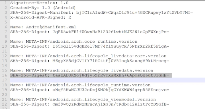 1. Manifest-Version 用来定义manifest文件的版本,例如:Manifest-Version: 1.0 2. Created-By 声明该文件的生成者,一般该属性是由jar命令行工具生成的,例如:Created-By: Apache Ant 1.5.1 3.Name 声明了apk中所有的文件。 4.SHA-256-Digest 对apk中所有文件中对应name的文件的校验码。文件内容发生改变时校验码也随之发生改变,防止文件被修改。