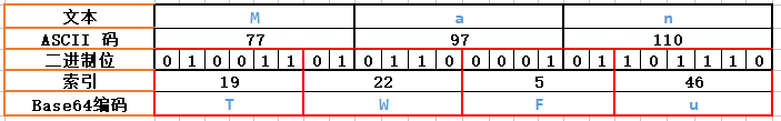 - 第四步:用上面的值在Base64编码表中进行查找,分别对应:T、W、F、u。因此“Man”Base64编码之后就变为:TWFu。