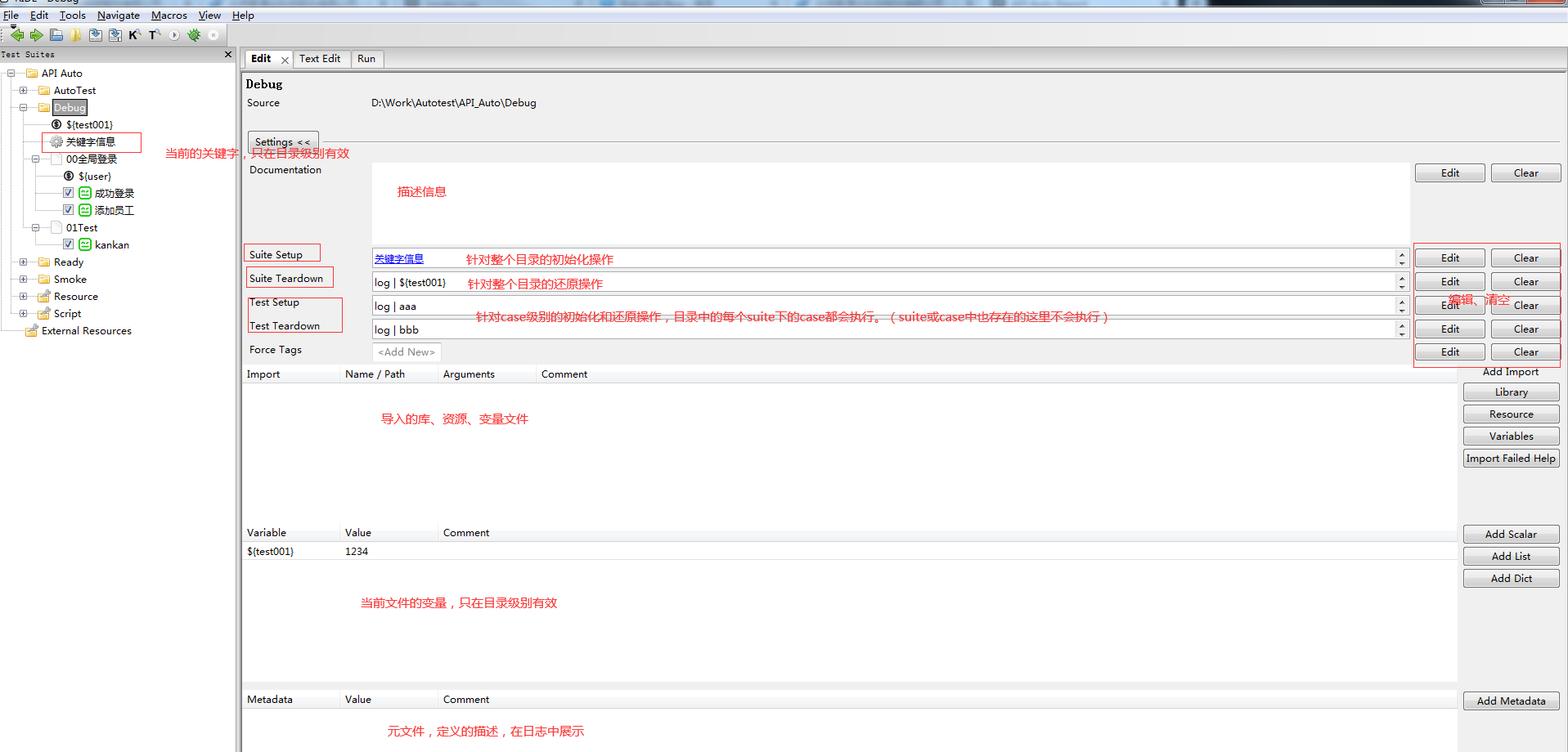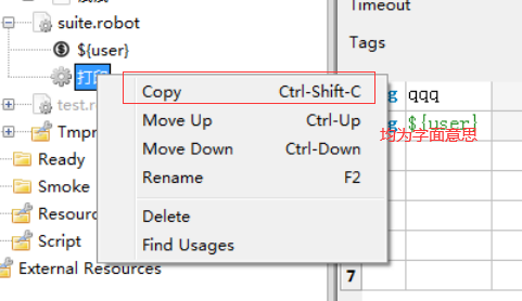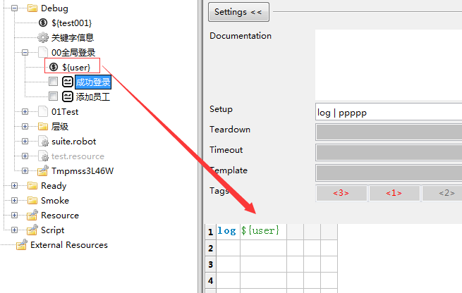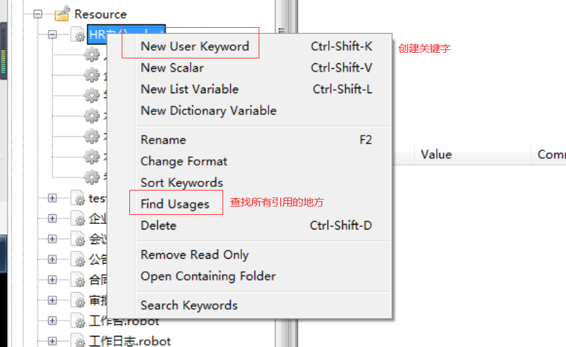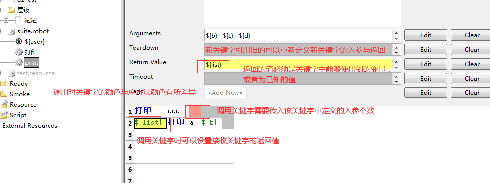 User Keyword为工具的核心内容,相当于语言中的定义函数,User Keyword可以定义在Suite和Resource中,大多数的关键字都应该定义在Resource中,定义在Resource中可以在引用该Resource的位置进行调用,User Keyword定义时Arguments为入参,个数为0-n个,入参只能为变量形式。Return Value为关键字返回值,个数为0-n个,返回值必须为已知的信息或变量,User Keyword可以使用已经定义的User Keyword,传入对应User Keyword需要的入参,可以接受User Keyword的返回结果进行处理。
