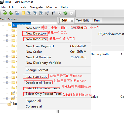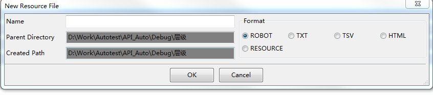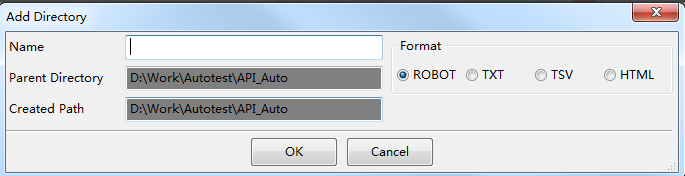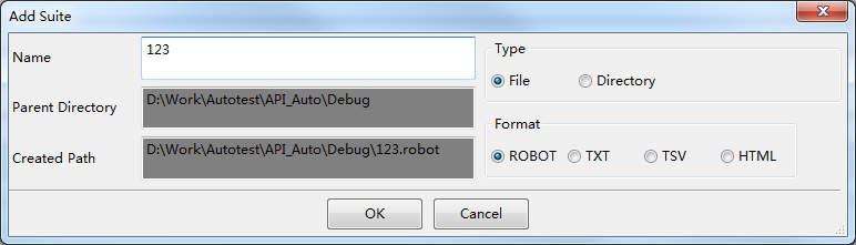 Suite建立时可选择为File和Directory,当Type选择Directory时相当于直接建立Directory。选择File时相当于建立文件,Suite文件操作类似__init__文件,只针对Suite下的关键字和case有效,Suite中创建的变量,在其下的case均可以引用到。注:只有suite文件下才可以建立出用于执行的case
