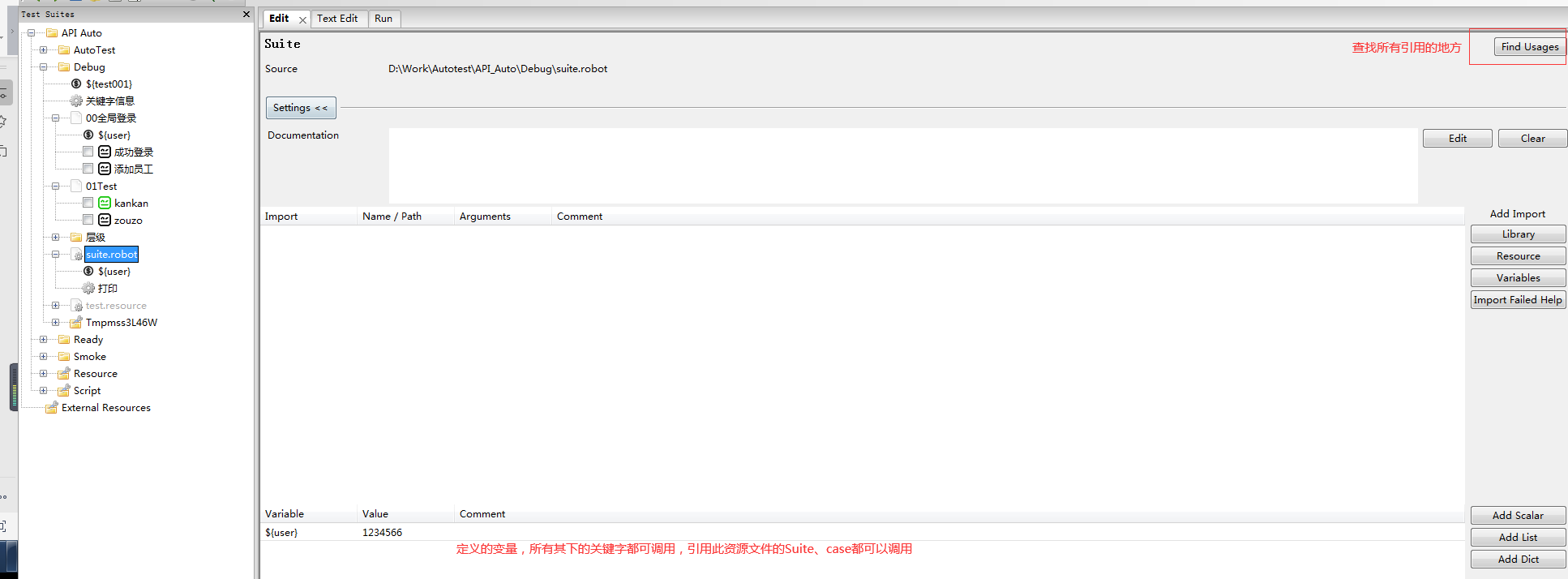 Resource为文件类型,可以在初始化的__init__文件、Suite文件及Resource文件中的Import引用Resource进行引用