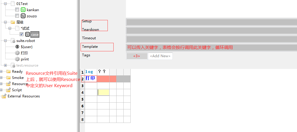 只有Case是可以被选择执行的,Case中调用的关键字会一层一层向里执行,最里层为库方法,Suite为最外层不能再引用,Setup、Teardown对应Suite中的Test Setup、Test Teardown,都传入参数时只执行Case中的
