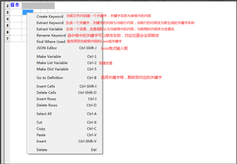 表格对应的操作也可以通过对应的按键快捷方式,表格中使用的关键字可以通过鼠标双击的方式或Ctrl+点击的方式跳转对应的关键字,鼠标点击并悬停在对应的关键字可以提示来源,按下Ctrl可以提示详情描述,鼠标点击并悬停在关键字后方需要传入参数的位置,可以提示要传入参数的参数名称。