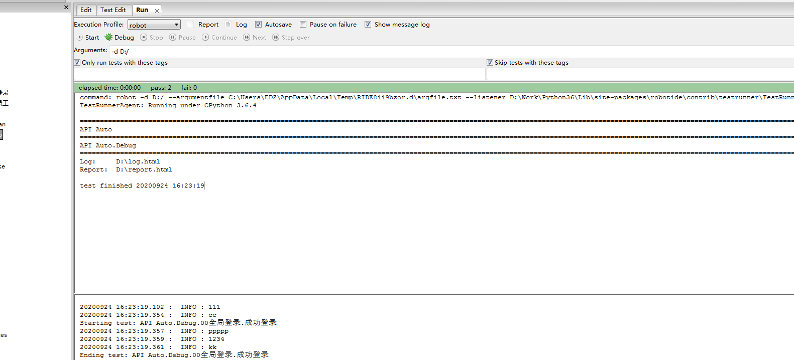 Pause on failure:失败时暂停,可以选择Stop、Continue、Next、Step over Show message log:是否展示运行的日志